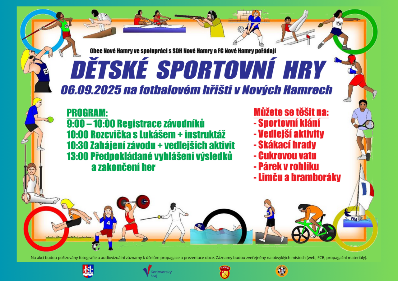 Přijďte na sportovní den pro děti, který se koná 6. září 2025 na fotbalovém hřišti. Od 09:00 do 10:00 bude probíhat registrace závodníků a hry budou zahájeny v 10:00. Podrobnější informace naleznete v přiloženém letáku.
