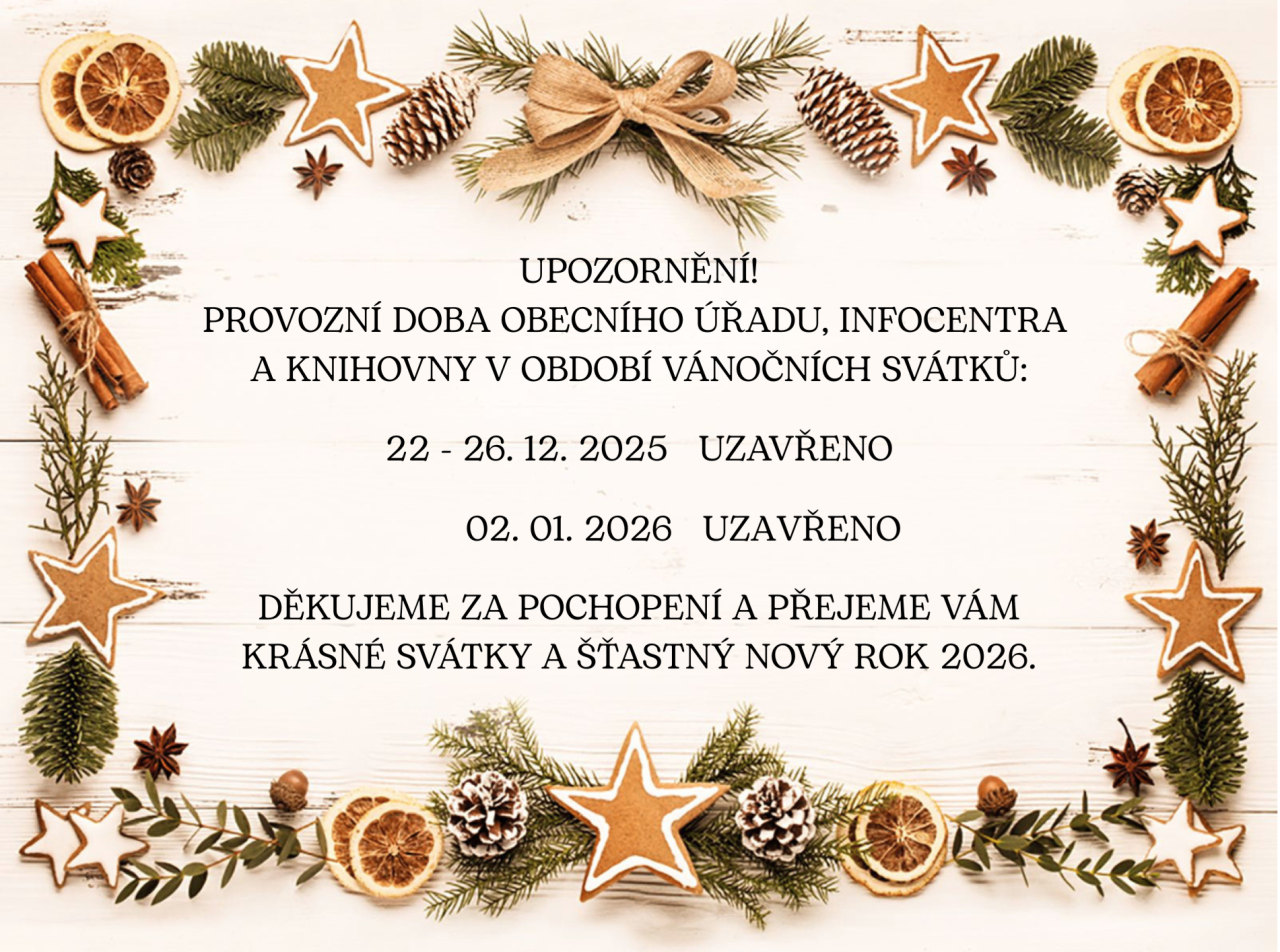 Vážení občané, rádi bychom vás informovali o provozní době Obecního úřadu, infocentra a knihovny během vánočních svátků. Všechny zmíněné instituce budou uzavřeny od 22. do 26. prosince 2025 a také 2. ledna 2026. Děkujeme za pochopení a přejeme vám krásné svátky a šťastný nový rok 2026.