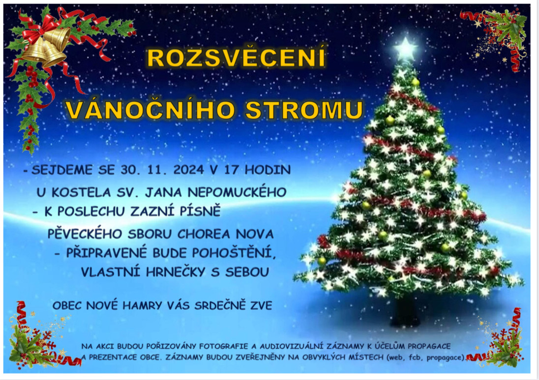 Dne 30.11.2024 proběhne již tradiční "Rozsvěcení Vánočního stromu" u kostela sv. Jana Nepomuckého. K poslechu zazní písně sboru Chorea Nova a nebude chybět něco dobrého od místních žen. Vlastní hrnečky na čaj nebo svařák můžete vzít s sebou (k dispozici budou i na místě).