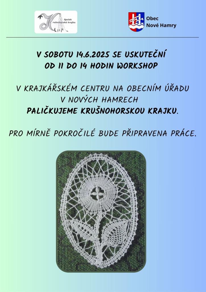 Přijďte si vyzkoušet paličkování tradiční krušnohorské krajky na workshop, který se uskuteční v sobotu 14. června 2025. Akce začne v 11 hodin a potrvá do 14 hodin. Mírně pokročilí účastníci si mohou vybrat z připravených prací. Těšíme se na vaši účast v krajkářském centru na obecním úřadu v Nových Hamrech!